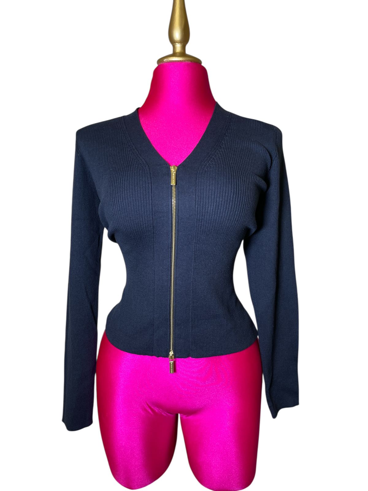 Este suéter tejido Michael Kors en color negro redefine el estilo clásico con un toque contemporáneo. Su tejido acanalado abraza la figura con suavidad, mientras su cierre dorado frontal —grabado con el logo de la marca— le da ese aire sofisticado y poderoso que caracteriza a las mujeres Michael Kors.